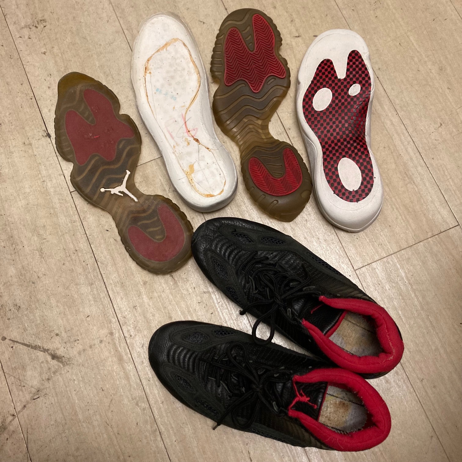 Air Jordan 11 Low " Black-Dark Grey-True Red " 1996年モデルです。 経年により接着剤が劣化し、ソールパーツが簡単に剝がれてしまいました。 ミッドソール内部に埋め込まれているエアバックが硬化でパンク、再利用が難しいので、スポンジで形成し交換しました。 写真は、Airバックを交換して蓋をし、(元の形に戻し)再構築をする前です。