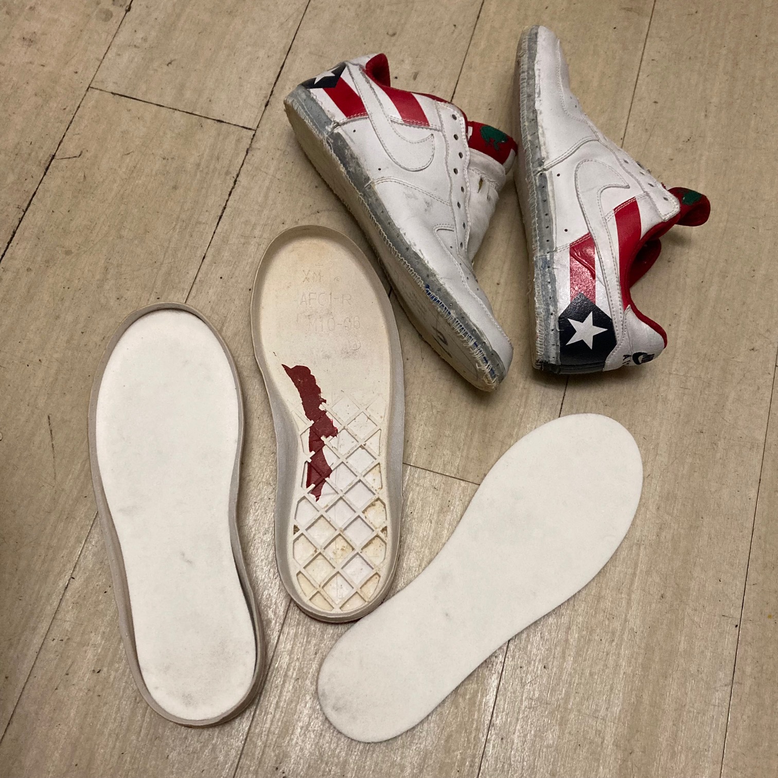 Nike Air Force 1 Low Premium "Puerto Rico 7" 2006年モデルです。 ソール内部のウレタンユニットが加水分解によりボロボロになってしまいました。履き続けると、ソールのサイドに亀裂が入って裂けてしまいます。写真は、ソールを解体➔掃除➔内部ユニット形成(EVAスポンジ)し、組み立てる前です。スポンジは基本的に劣化の心配はないので安心です。