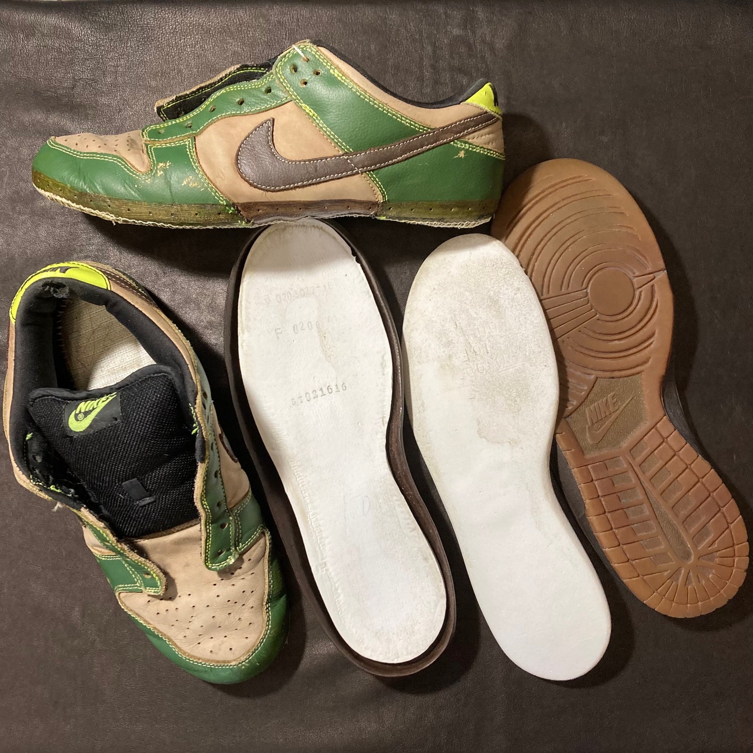 Nike Dunk Low Pro SB " Jedi " 2004年モデルです。 接着面が経年劣化で開いてしまっておりましたので、一度ソールを解体し古い接着剤を出来る限り除去、再構築いたしました。 写真は、掃除して再構築する前の状態です。ソール内部のユニットはスポンジ素材で加水分解はしませんので再利用しております。