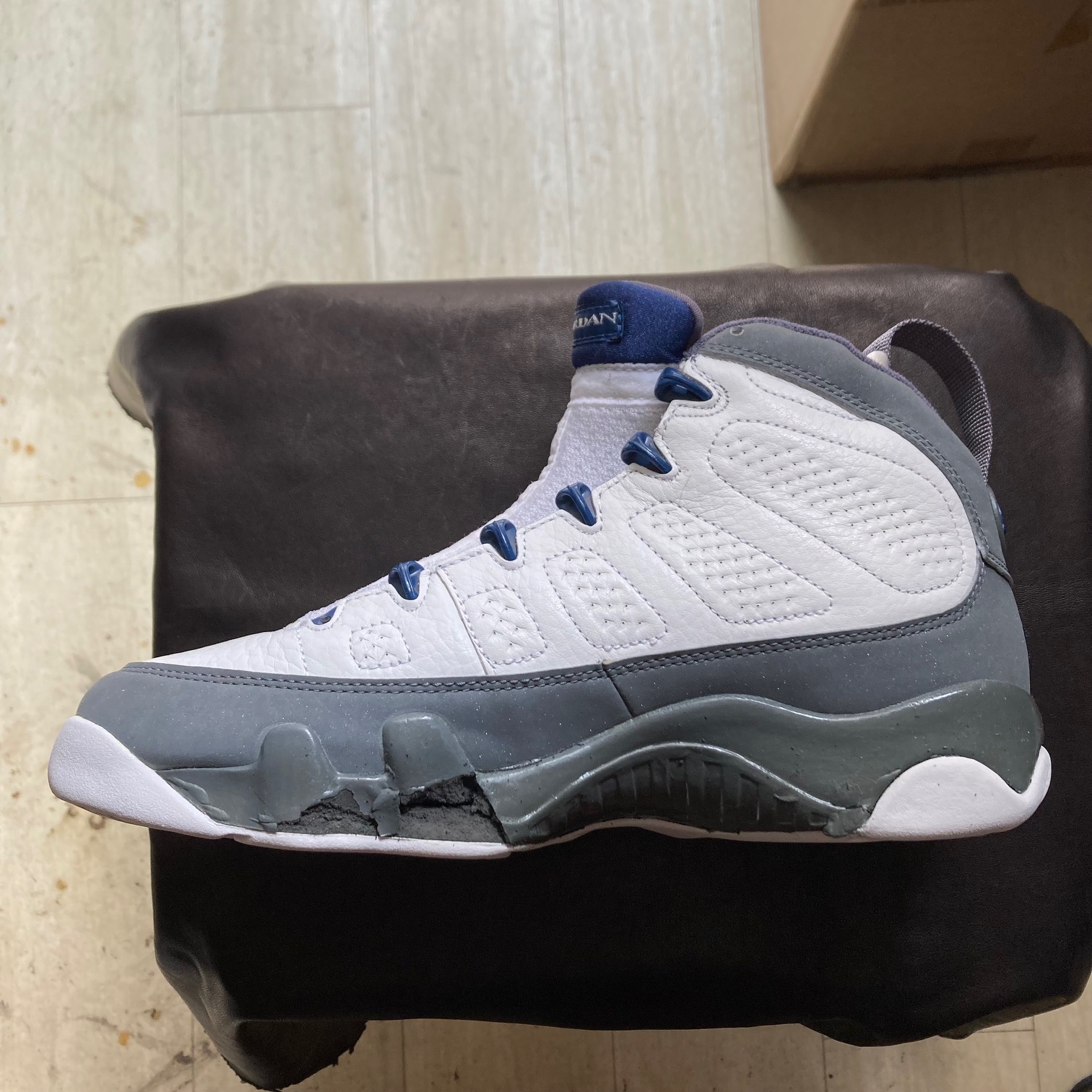 Air Jordan 9 Retro "White/French Blue-Flint Grey" 2002年モデルです。 ミッドソールが加水分解してしまったため、ソールを交換させて頂きました。