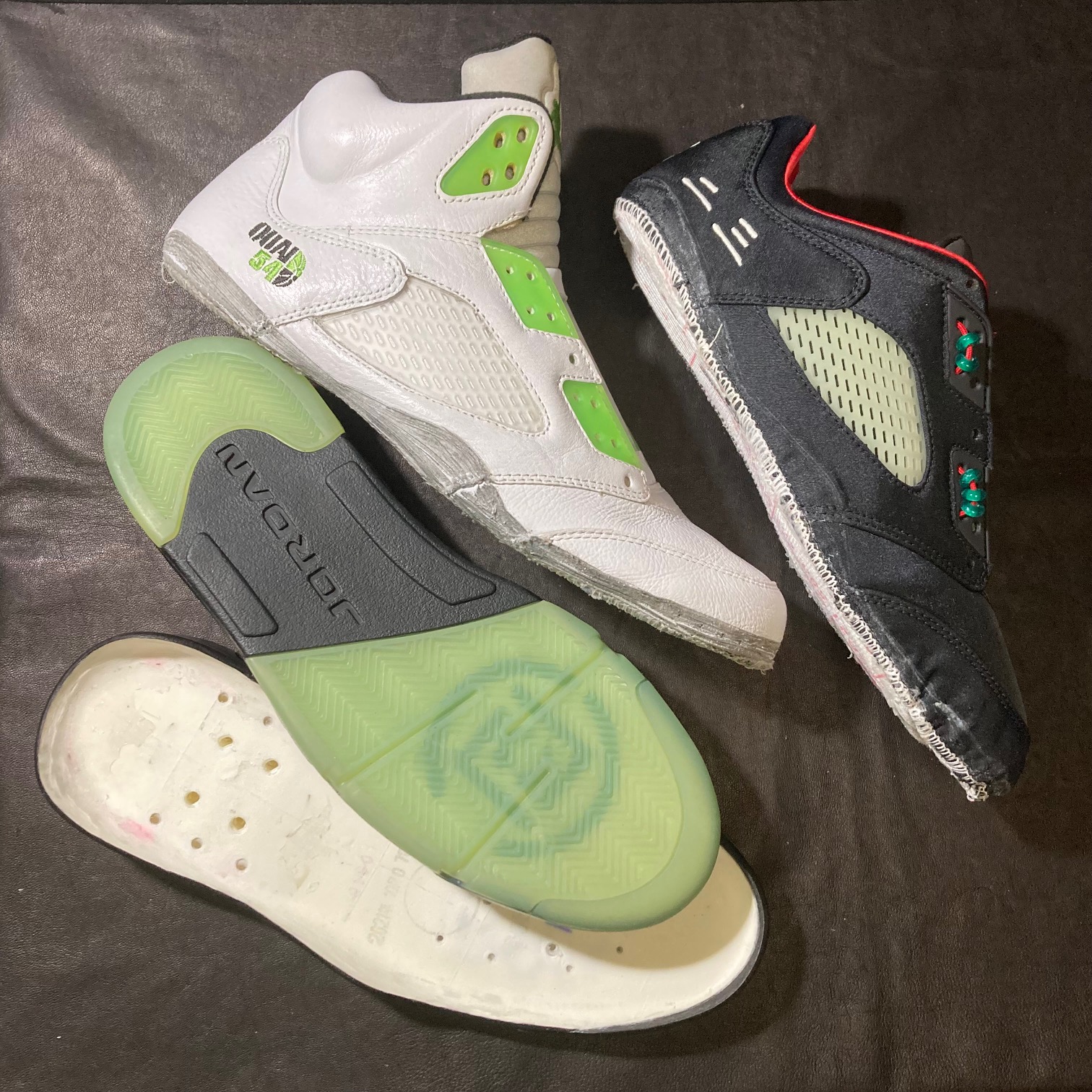アッパードナーが、 Air Jordan 5 Retro Q54 " Quai 54 " 2011年モデルで、ソールドナーが 、Air Jordan 5 Retro Low SP " Clot/Jade " 2022年モデルです。 Quai 54を復活させたいという事で、Clotのソールを移植しました。