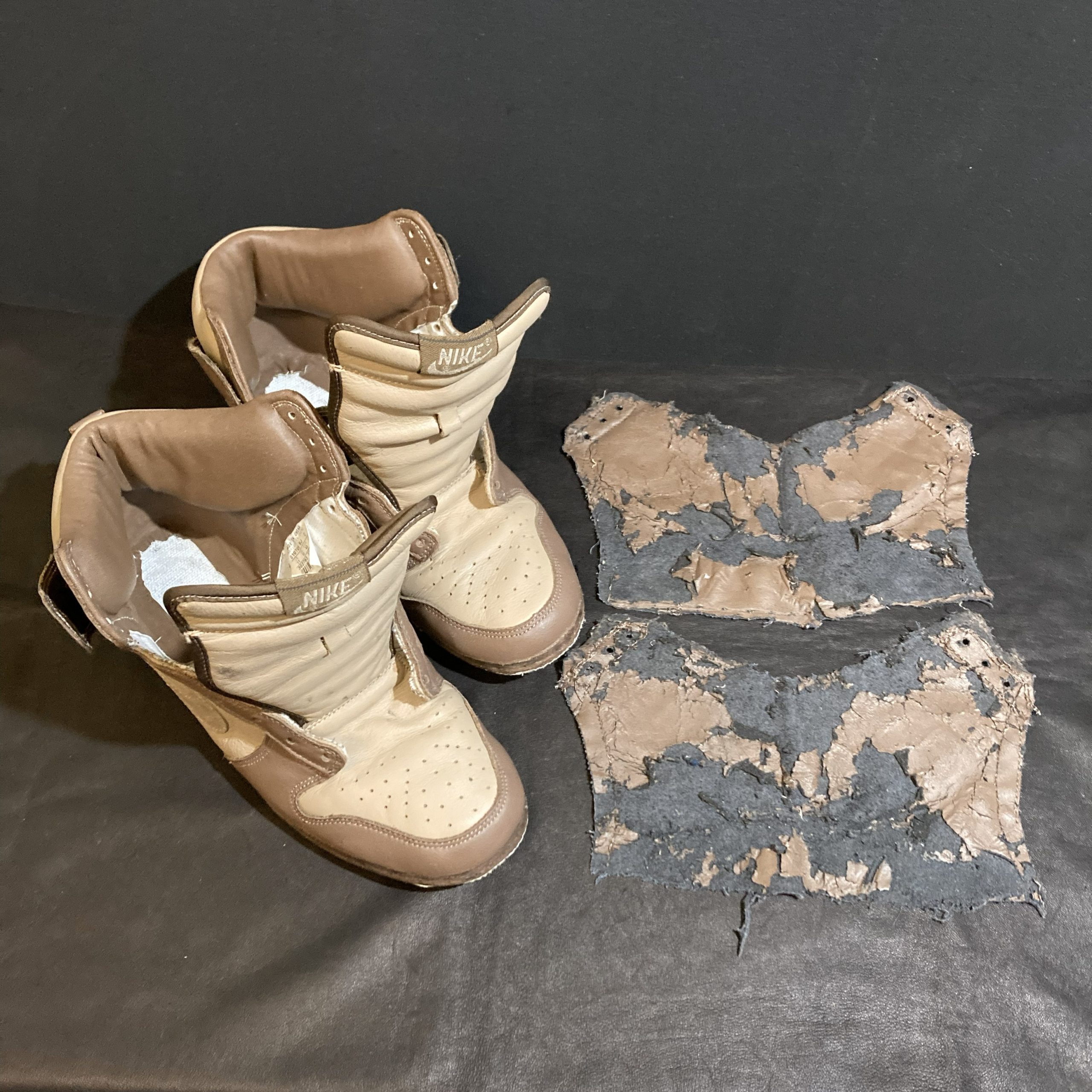 Stussy x Nike Dunk High Plus B " Ostrich " 2001年モデルです。 アンクル内側のフェイクレザーが経年で表面剝離してボロボロに、、。 写真はレザーに張替えた後の状態で、右側にある物は、剝がしたフェイクレザーです。