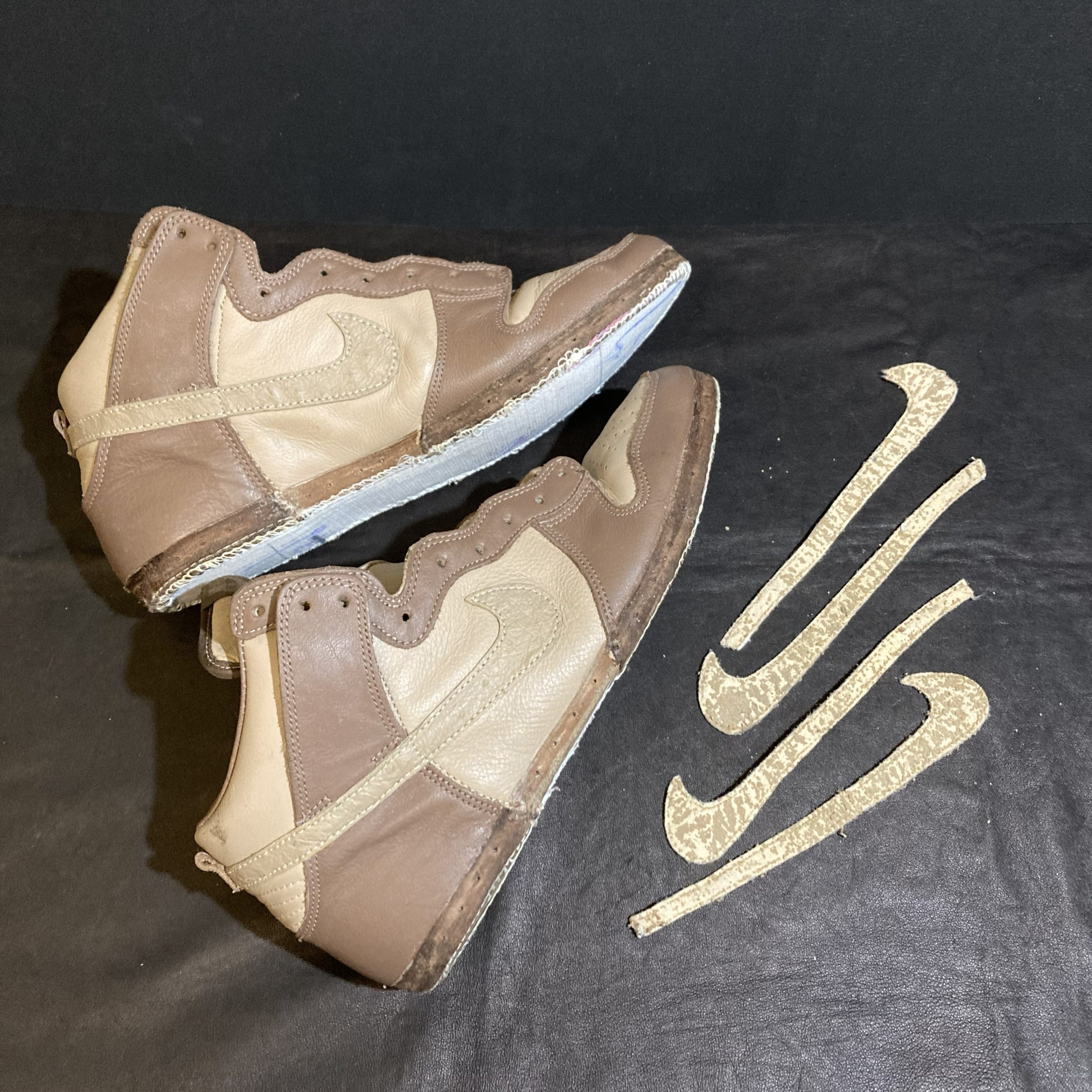Stussy x Nike Dunk High Plus B " Ostrich " 2001年モデルです。 オーストリッチ調(フェイクレザー)のスウッシュが、経年劣化により表面剝離しボロボロになってしまいました。 写真は、スウッシュをオーストリッチの革に交換した状態と、右側は、取り外した劣化してしまったスウッシュです。