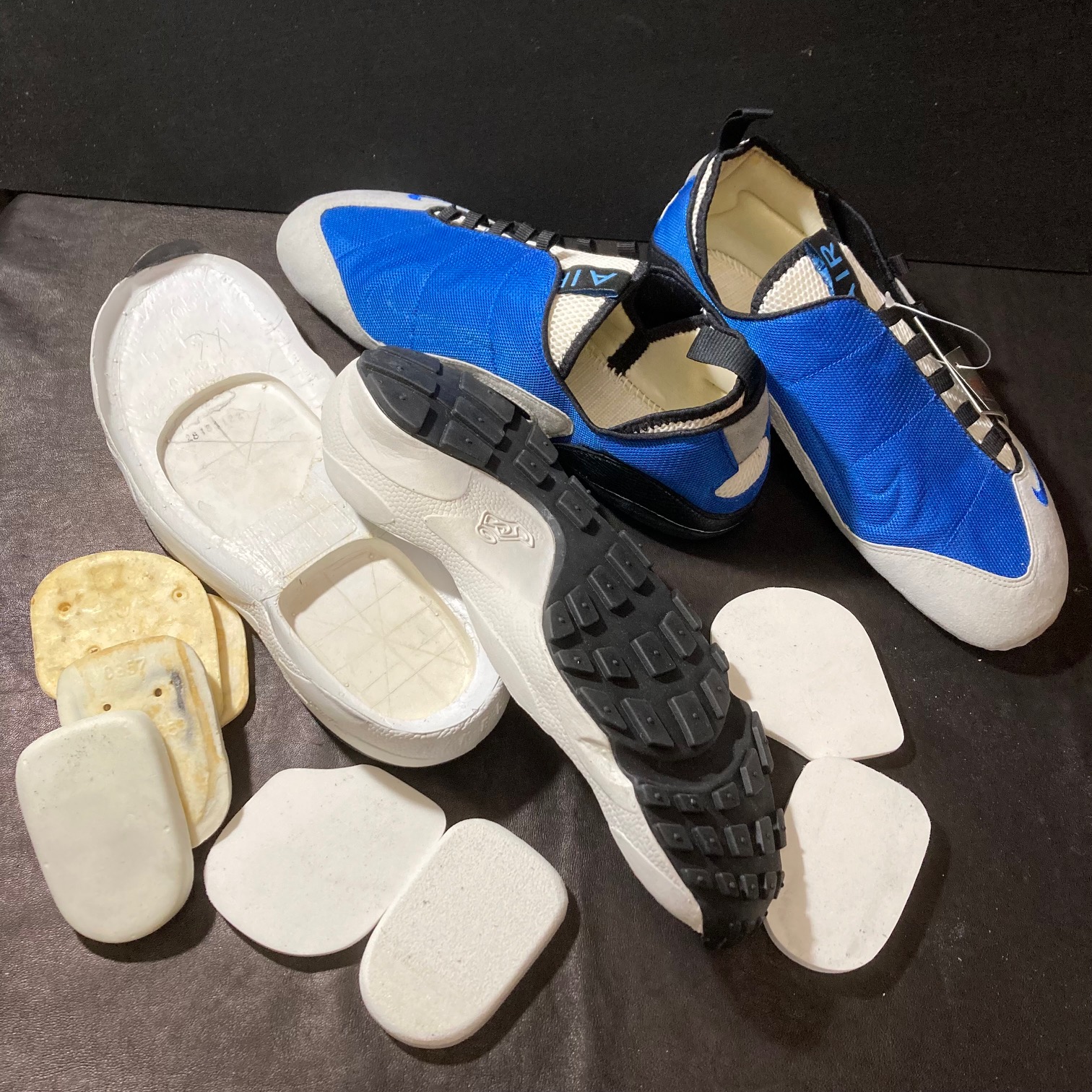 Nike Air Footscape "Varst Royal/White" 2005年モデルです。経年による接着剤の劣化で、簡単にパーツがバラバラになってしまいました。 ヒールパーツ(ウレタン製)、バックチップ(リフレクター素材)も経年により劣化し、ボロボロになってしまいました。 写真は解体可能なパーツを解体、Airパックが入っている部分を型取りしたスポンジで形成、アウトソールを再接着、ヒールパーツ(スムースレザー)、バックチップ(スエード)に交換、組み立てる前段階となります。