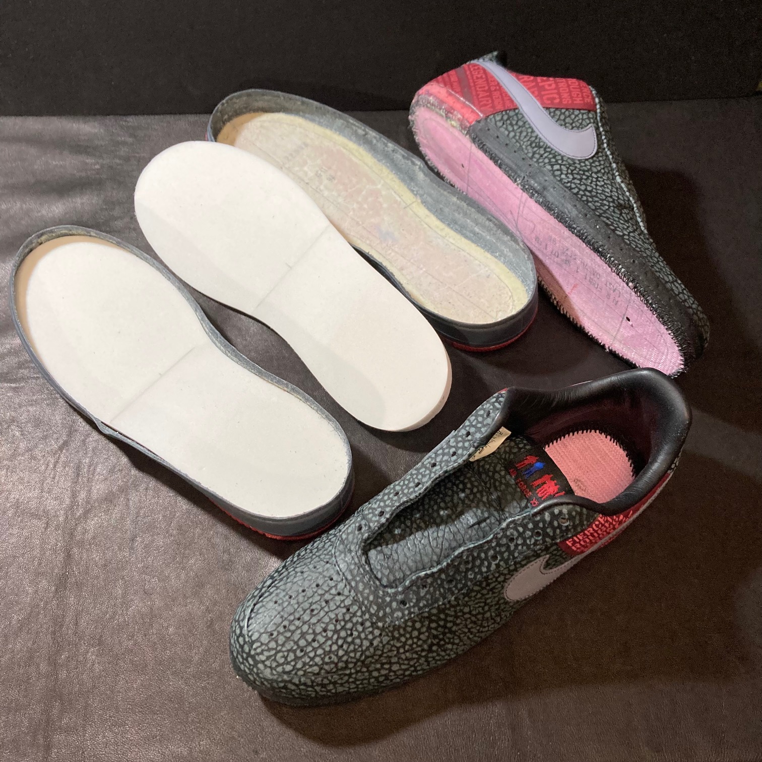 Nike AF1 SPRM '07 " Moses Malone " 2007年モデルです。 ソール内部のウレタンユニットが、加水分解によりボロボロになってしまいました。 今回インサイドアウト(I/O)仕様で、アウトソールが分離する形のソールユニットです。 ミッドソールが柔らかく、型崩れし易い素材が多いため、ユニット作製は通常よりも手が掛かります。 写真は、ソールを解体➔掃除➞アウトソール再接着➔内部Airユニット形成(EVAスポンジ)し、 組み立てる前です。スポンジは基本的に劣化の心配はないので安心です。